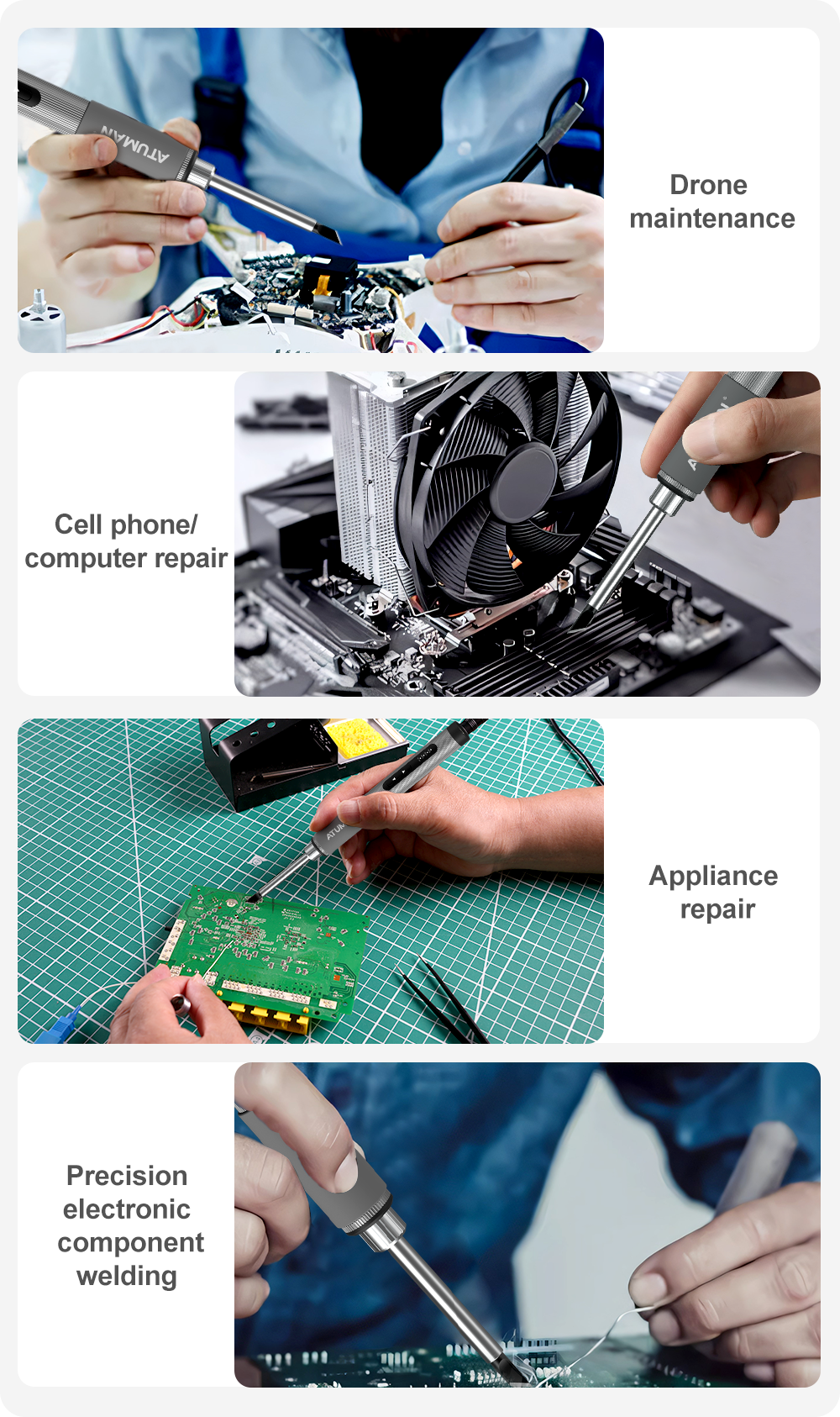 Pen-sized compact appearance, that is to take and use, no welding table, easy to store and good to carry, out of the house without the need for an outlet, whether it is a computer, mobile power or wall plugs, anytime and anywhere for your soldering iron to supplement the power, the work is no longer limited to the power outlet, the operation is more convenient.