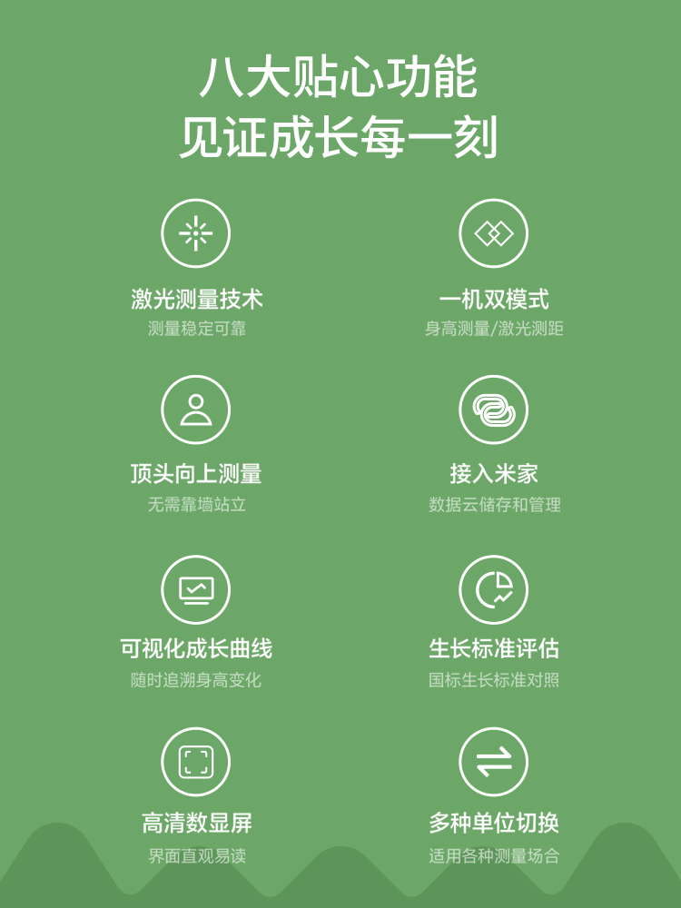 接入米家 APP,一键同步数据,自动生成可视化成长曲线,对照国标生长标准智能评估。还支持多成员管理,一人一档,孩子每一段长高轨迹,都清晰可查,育儿更安心。
