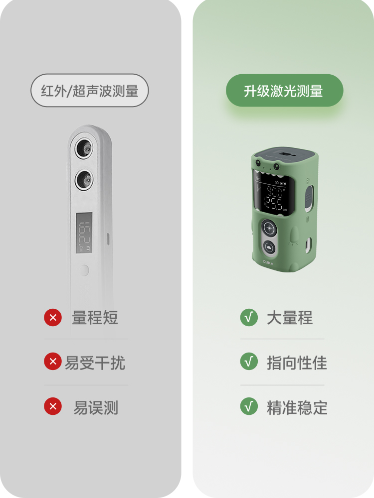 区别于传统红外、超声波易受环境、角度、遮挡影响的短板,它采用高精度激光测量技术,毫米级精度,秒速出数,不惧踢脚线、光线、姿势小偏差,测量稳定又可靠。