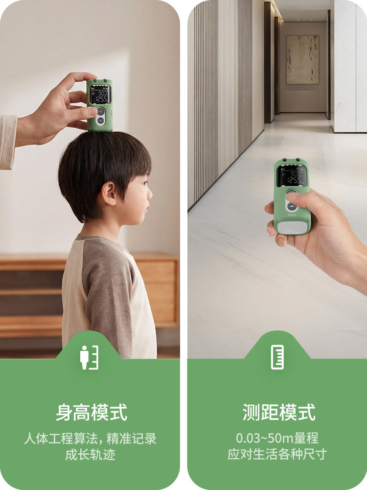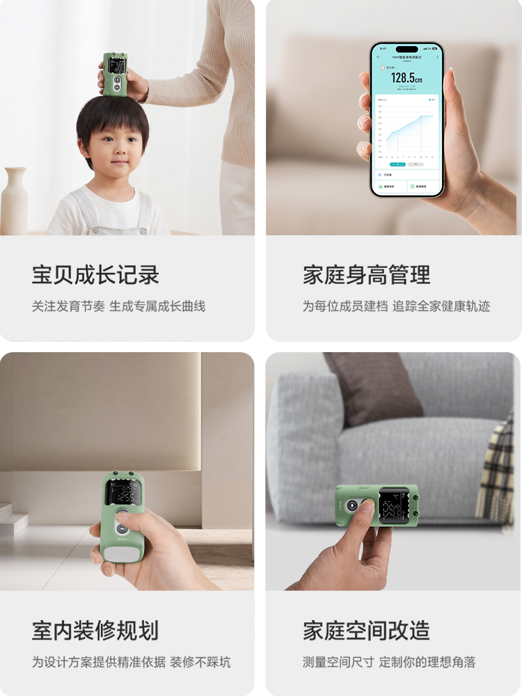 它不只是身高仪,更是生活实用小工具。人体身高模式:专为儿童、成人优化算法,精准捕捉身高数据,自动记录成长轨迹;激光测距模式:0.3~50m 量程,家居丈量、装修尺寸、物品测量随手搞定,一台顶两台,家用实用性拉满。